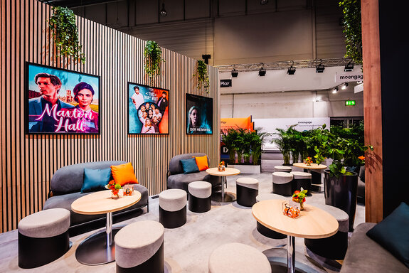 Mitten im Messetrubel haben wir einen Ort geschaffen, der sich nach "Ankommen" anfühlt. Fließende Übergänge und warme Materialien nehmen den Besuchern die Hektik der Halle ab. Vertikale Akustikpaneele in Holzoptik ziehen sich wie ein roter Faden durch das Design – sie geben dem Stand Struktur und sorgen für eine spürbare Ruhe, die echte Gespräche erst möglich macht.