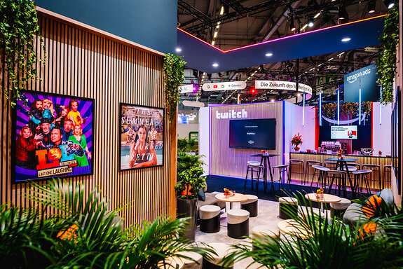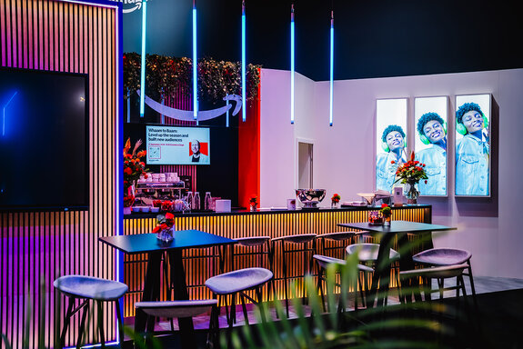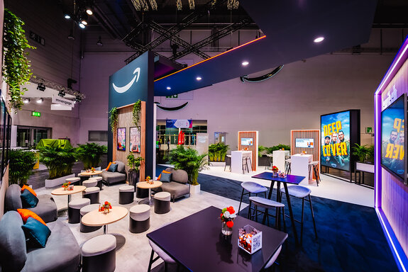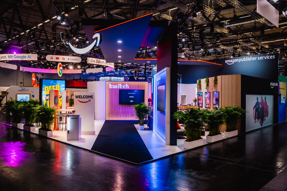 Wer den Stand von Amazon Ads auf der dmexco betrat, tauchte sofort in vertraute Welten ein. Es war ein Zusammenspiel aus dem leuchtenden Lila von Twitch, dem kühlen Blau von Prime Video und dem klaren, fokussierten Weiß von Amazon Ads. Unsere Aufgabe war es, diese unterschiedlichen Identitäten nicht nur nebeneinander zu stellen, sondern sie in einem harmonischen Raum zu erden.