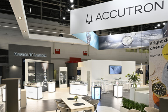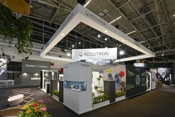 Auch abseits dieses Highlights setzten wir auf klare Strukturen und Orientierung. Ein dominanter, massiver Deckenkubus mit perfekt gespannten Backlit-Stoffen fasste die verschiedenen Marken des Konzerns – wie Accutron und Bulova – strukturiert zusammen und sorgte für immense Fernwirkung in der Messehalle.