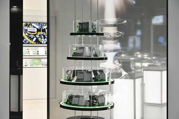 Unsere Werkstätten haben für diesen Auftritt eine mehrstöckige, maßgefertigte Acrylglas-Konstruktion geschaffen. Mit exakt gesetzten, grün beleuchteten Kanten rückte dieses Zentraldisplay die Jubiläums-Uhren markant in den Vordergrund.