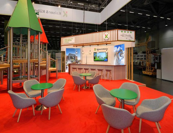 Eingebettet in die Spiellandschaft, profitierten Kommunikationszonen von der fröhlichen Umgebung und lockerten die Fachgespräche auf. Die Verschmelzung der bunten Exponate mit dem Messestand,