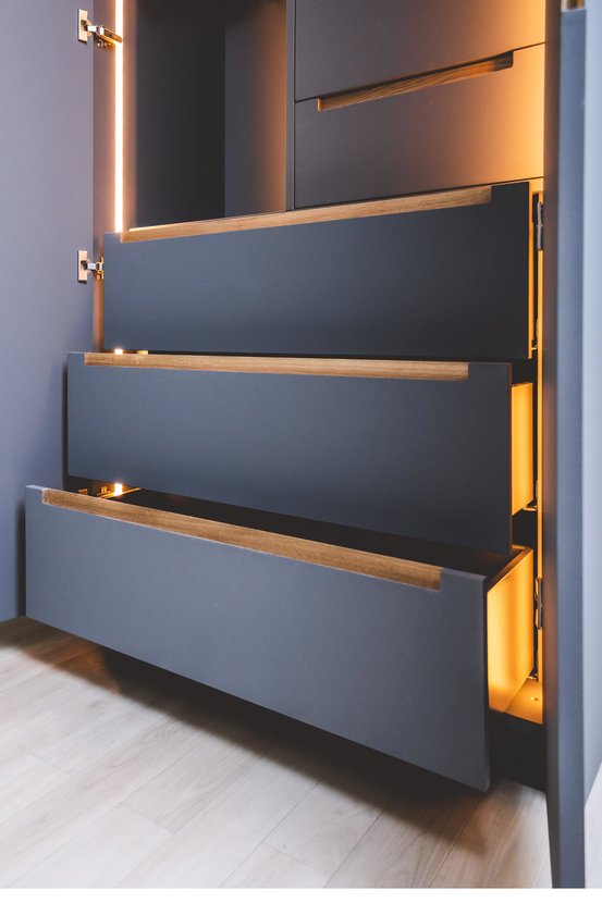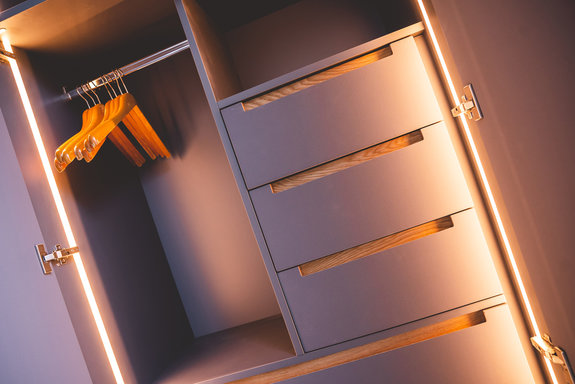 Erweitert wird der Grad der persönlichen Note durch eine LED-Beleuchtung, die nicht nur Licht in das Dunkel bringt, sondern dem Ganzen einen illuminierten Rahmen verleiht. Veredelt wurde der Korpus durch einen Nextel Lack, der dem Schrank eine robuste und hochwertige Oberfläche verleiht.